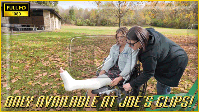 Here’s a shoot from around Halloween that I meant to post the same day but I decided to post the Audrey/Lily clip first instead. Nicole is a female MMA fighter (based on reality) that recently broke her tibia and fibula while kicking her opponent in a fight. She’s hanging out at the park with her friend Joe Joe and talking about the Halloween party tonight. Nicole is going as Sara Conner from Terminator. She’s already got the jean jacket and other clothes that will work but she feels that some wooden crutches would really sell the early 80’s look so they decide to hit the local antique mall and see what they can find there. Joe Joe helps her get up into the big truck and get her long straight leg in, but Nicole has to sit sideways for it to work. At the antique mall, Joe Joe pushes her around in the chair and Nicole has her long, straight LLC propped up high on a leg rest. Nicole mostly sits but sometimes gets up on her crutches to look around. Joe Joe is very helpful as Nicole’s leg is very freshly broken and very sore so she’s careful to be gentle with propping it up and helping Nicole back into the chair, but sometimes Nicole does kind of plop down. Other than that, Nicole and JoJo just go down the aisles looking at things and talking to each other about it. She definitely got a lot of questions and unfortunately a few times were off-camera. They don’t have much luck finding the kind of crutches she’s looking for but they did find some very old antique crutches. Finally Joe Joe gets Nicole back into the truck and they just decide to let her leg stick out of the window on the way home. |